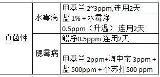 4、注意觀察及早發現及時對癥治療。鰻魚健康時活動良好,發病時活動異常、食欲下降,要及時檢查確診。檢查內容包括皮膚粘液、內臟器官(肝、膽、腸、胃、腎)、鰓組織(主要檢查寄生蟲、霉菌、細菌),另處還可通過肉眼觀察以及實踐經驗進行判斷,有的放矢地選擇藥品對癥下藥。如鰻魚發生鰓霉病要用亞甲基蘭而不能用抗菌素。鰻魚常發生的病害及治療方法筆者總結如下表。
